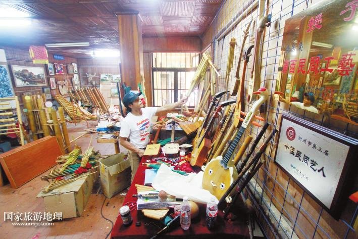 國家旅游地理 廣西柳州11月11日訊(記者陸旺楊春) 牽手漫步龍?zhí)睹琅希⒓缈勘炽逶⊥砬锱?,你會時常聽到一串串動人的音符:它時而渾厚圓潤、清脆響亮,時而輕靈縹緲、悠長凄美。不忍打破這份寂靜閑情,卻又忍不住猜想:這是何方人士,用何種樂器,吹拉彈撥出如此佳音?穿越叢林,循聲走去,瑤寨庭前,幾個年輕男女手握蘆笙,身子左搖右晃,吹得正起興。步入瑤寨一樓才發(fā)現(xiàn),這里儼然一個生產(chǎn)民族樂器的大工廠:木板、竹竿、鐵鋸、膠水、油漆,以及形狀酷似牛頭、牛腿、魚身、龍身等顏色各異、五花八門的樂器……一位正在給樂器上漆的中年人梁志榮告訴記者,這是龍?zhí)豆珗@正在籌建的民族樂器館,也是魚峰區(qū)創(chuàng)建廣西文化強區(qū)的特色景區(qū)之一,他現(xiàn)在是大龍?zhí)睹褡逅囆g(shù)團團長,研究、制作民族樂器將近20年,曾獲“廣西民間工藝大師”和“十佳民間藝人”稱號。