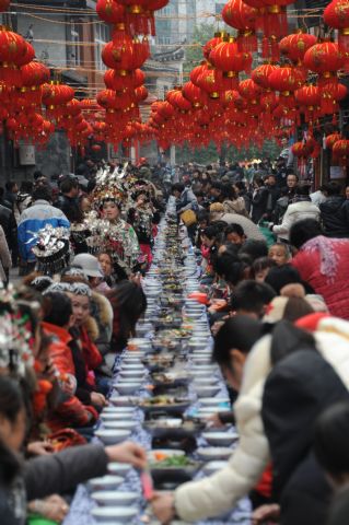 2月14日,湖南鳳凰景區(qū)擺起近百米長的苗家長龍宴,當?shù)鼐用窈陀慰凸矐c元宵佳節(jié)。