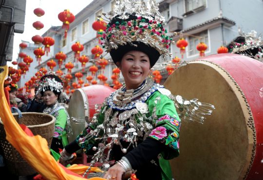 國家旅游地理 湖南湘西2月15日訊 2月14日,湖南鳳凰苗族婦女打起苗鼓。當日是農(nóng)歷元宵節(jié),在湖南鳳凰古鎮(zhèn),當?shù)鼐用衽c游客歡聚一堂,共同參與各種民俗文化表演活動,慶祝節(jié)日。 /新華社記者 范軍威 攝