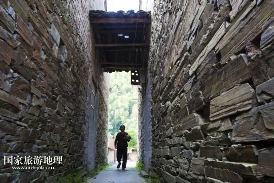 5月12日,土目源村村民走在石巷中。