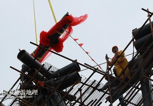 國家旅游地理 上海8月3日訊 8月3日,上海機(jī)械施工集團(tuán)公司的工程人員指揮最后一榀桁架的吊裝。當(dāng)日上午,隨著塔冠結(jié)構(gòu)中最后一榀鰭狀桁架緩緩起吊并安裝到位,歷時(shí)近6年建設(shè)的“上海中心”按計(jì)劃順利達(dá)到設(shè)計(jì)高度632米,刷新了“申城之巔”的新紀(jì)錄。據(jù)介紹,“上海中心”2014年年底將實(shí)現(xiàn)除酒店精裝修部分外的土建竣工,2015年年中將投入運(yùn)營。新華社記者 裴鑫 攝