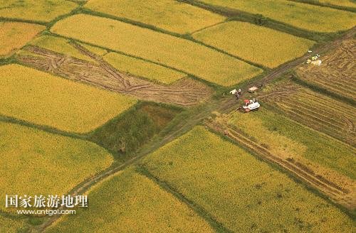 國家旅游地理 江蘇淮安9月27日訊 這是9月26日航拍的江蘇省淮安市盱眙縣鮑集鎮(zhèn)稻田收獲圖景。近期,江蘇省各地的水稻產(chǎn)區(qū)陸續(xù)開鐮收割。收割機踏著大地的指紋收獲金黃的稻谷,繪就一幅幅美麗的豐收圖畫。新華社發(fā)(周海軍 攝)