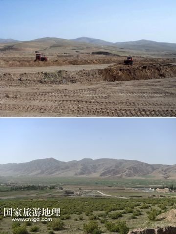 上圖上:2014年3月的資料照片上甘鹽池一片荒涼;上圖下:6月4日,記者拍攝的甘鹽池已是綠意盎然(拼版照片)。