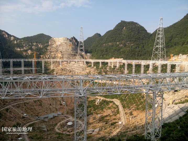 這是黔南平塘縣正在建設(shè)的大射電望遠(yuǎn)鏡,也稱(chēng) FAST,預(yù)計(jì)將于明年九月建成。FAST具有中國(guó)獨(dú)立自主知識(shí)產(chǎn)權(quán),是世界上正在建造及計(jì)劃中的口徑最大、最具威力的單天線射電望遠(yuǎn)鏡,其設(shè)計(jì)綜合體現(xiàn)了我國(guó)高技術(shù)創(chuàng)新能力。500米口徑球面射電望遠(yuǎn)鏡是利用貴州喀斯特地區(qū)的洼坑作為望遠(yuǎn)鏡臺(tái)址,建造世界第一大單口徑射電望遠(yuǎn)鏡,其擁有30個(gè)標(biāo)準(zhǔn)足球場(chǎng)大的接收面積。FAST作為世界最大的單口徑望遠(yuǎn)鏡,將在未來(lái)20至30年保持世界一流地位。