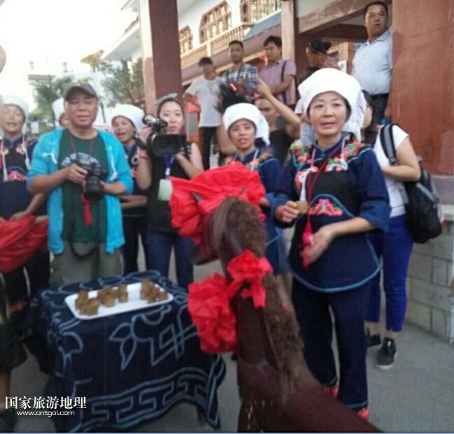 這是黔南惠水縣好花紅布依風(fēng)情寨,為了歡迎遠(yuǎn)方客人的到來(lái),布依族人在寨門(mén)前擺滿(mǎn)酒杯唱起山歌。在進(jìn)寨前客人都要喝三杯攔門(mén)酒,喝完才能進(jìn)入寨中。同時(shí),布依族習(xí)俗中,遠(yuǎn)方客人到來(lái),坐上木馬,喝完三杯米酒也寓意著會(huì)交好運(yùn)。