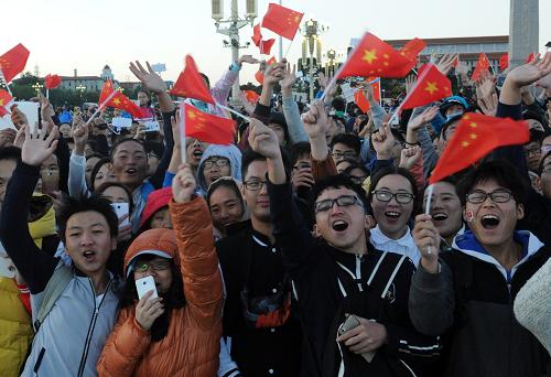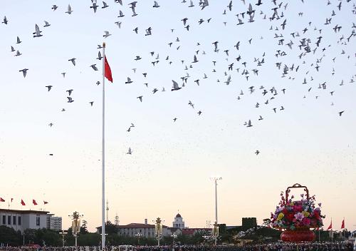 10月1日,天安門廣場舉行升國旗儀式。當日清晨,來自全國各地的各族群眾在北京天安門廣場觀看升國旗儀式,慶祝中華人民共和國成立66周年。新華社記者 邢廣利 攝
