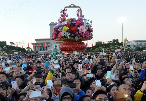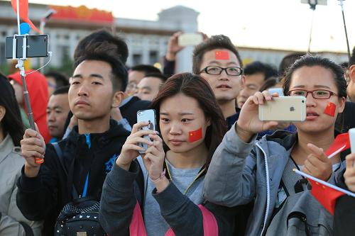 10月1日,各地群眾參加天安門廣場升國旗儀式。新華社記者 唐召明 攝
