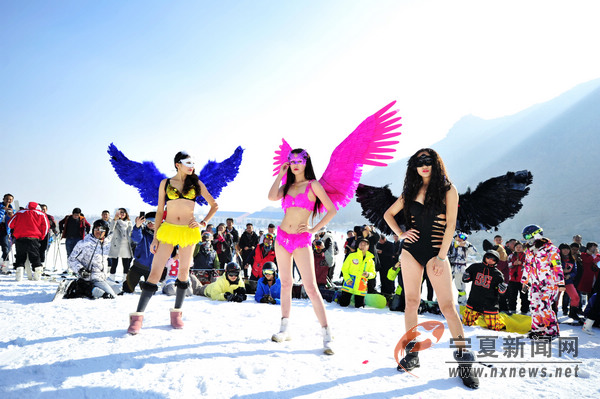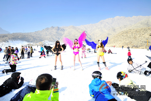 2016年1月1日,新年第一天,在銀川蘇峪口國(guó)家森林公園滑雪場(chǎng),幾位身著色彩艷麗比基尼美女在雪中秀身材并展示瑜伽技巧,吸引了眾多滑雪愛(ài)好者的目光。當(dāng)日,蘇峪口滑雪場(chǎng)前來(lái)滑雪的人達(dá)數(shù)千人。 寧夏新聞網(wǎng)記者 祁瀛濤 攝